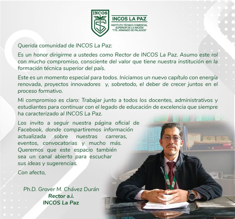 Actividades INCOS La Paz rinde homenaje al Bicentenario de Bolivia En el marco de las celebraciones por el Bicentenario de Bolivia, estudiantes, docentes, administrativos y directivos del Instituto Técnico Comercial Superior de la Nación «Tte. Armando de Palacios» – INCOS…